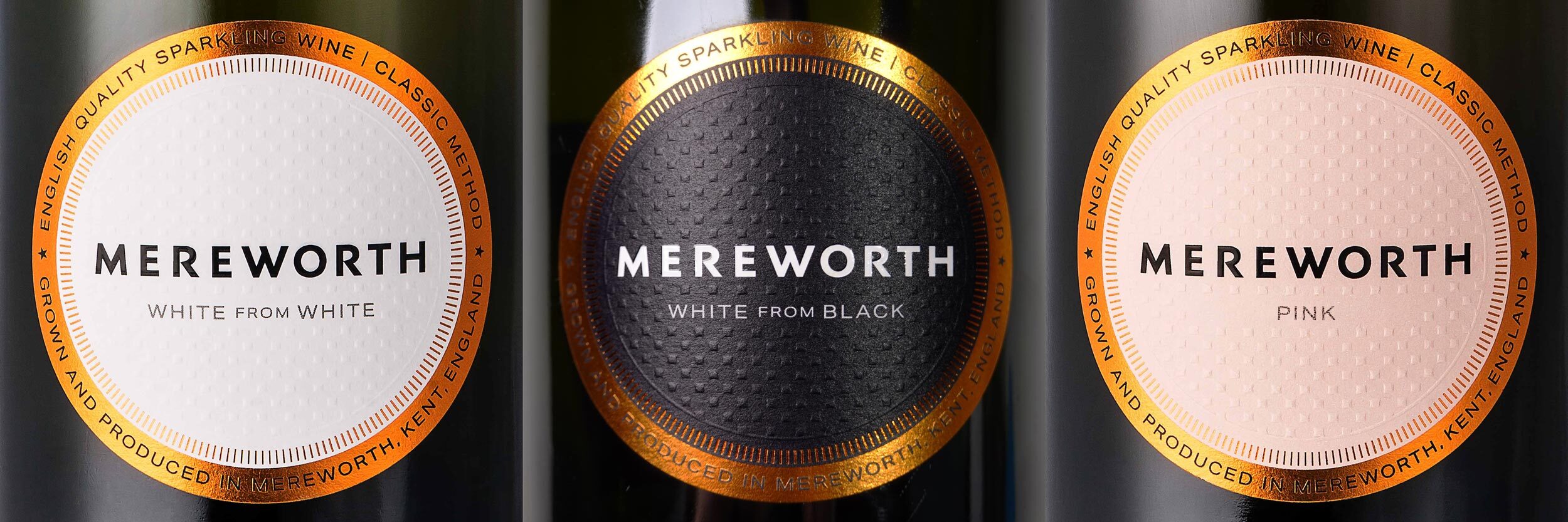 The core ideas in our final solution arrived as a result of this process. We then created dozens of iterations, working closely with Mereworth founder William Boscawen who introduced a master-stroke of his own. In order to make his sparkling wine a truly English product, he wanted to avoid the use of French terminology on the labels (unlike all other English producers). Thus, ‘Blanc de Blancs’ became ‘White from White’ and ‘Blanc de Noirs’ became ‘White from Black’. This idiosyncratic naming strategy dovetailed perfectly with our ideas for a classic modern design.